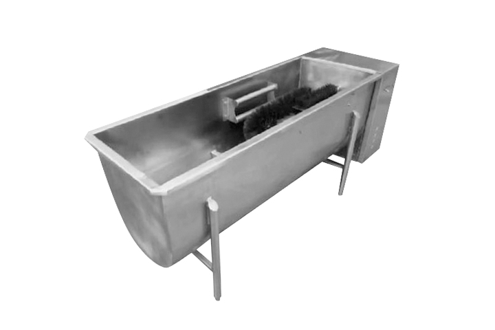 Gland packing is used to avoid leakage through the shaft. A stationary nylon brush is fitted with a bracket on the inner wall for cleaning the outside of the cans. Side stationary brush is changeable and it can be fitted on either side of the inner wall. Cylindrical nylon brushes, revolve at a low speed, i.e.80 to 100 rpm, in opposite directions by a motor and reduction gear unit, giving through an effective cleaning action on either side of the can. Steam and water connection are given to the tank for making warm water for the washing operation. At the bottom of the tank a drain valve is fitted for easy draining and cleaning of the tank.